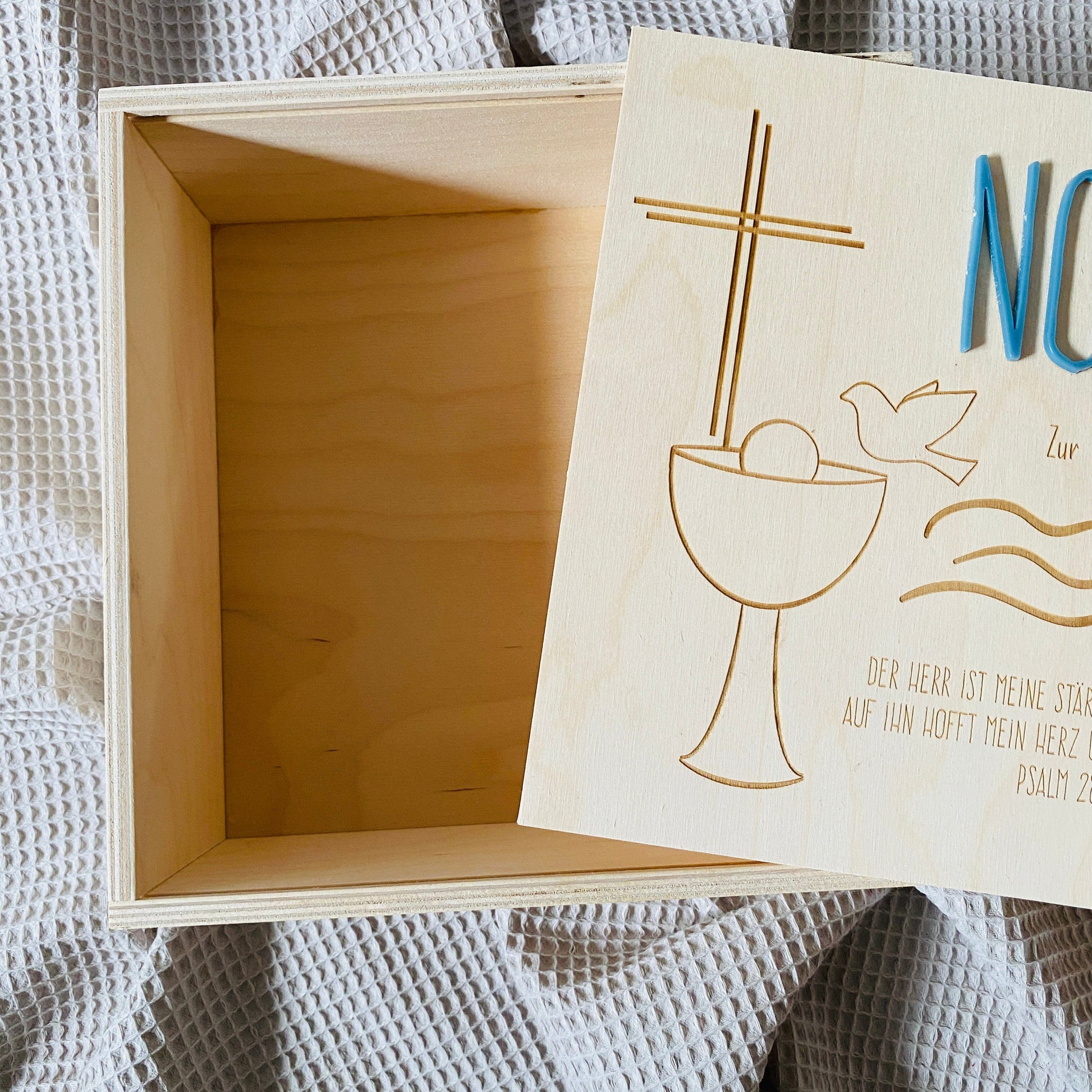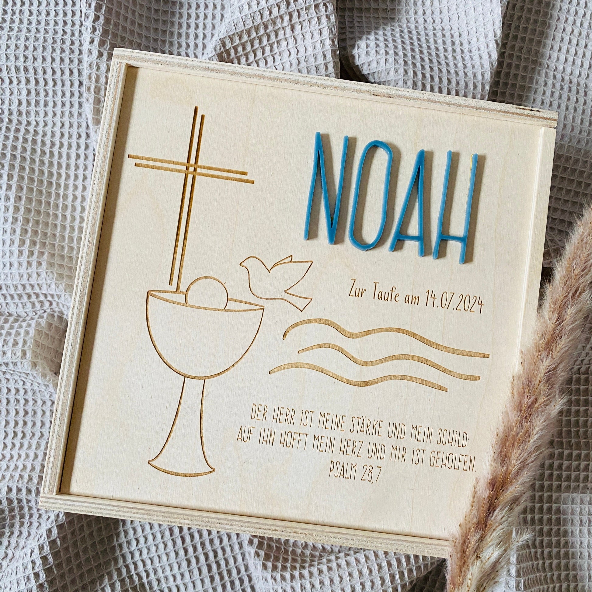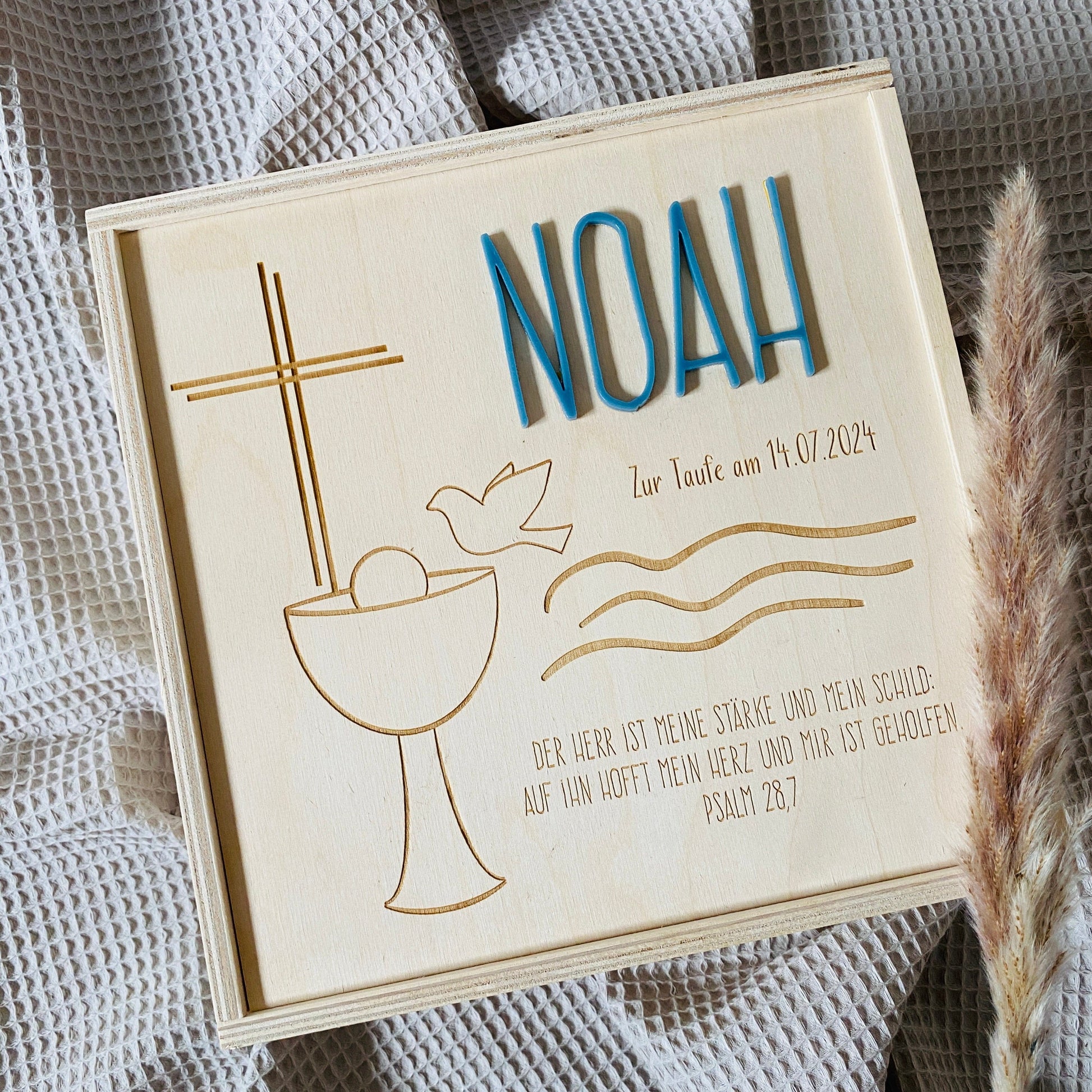 Holz‑Erinnerungskiste zur Taufe 20x20 cm – personalisiert mit Name, Datum & Motiv Gravur