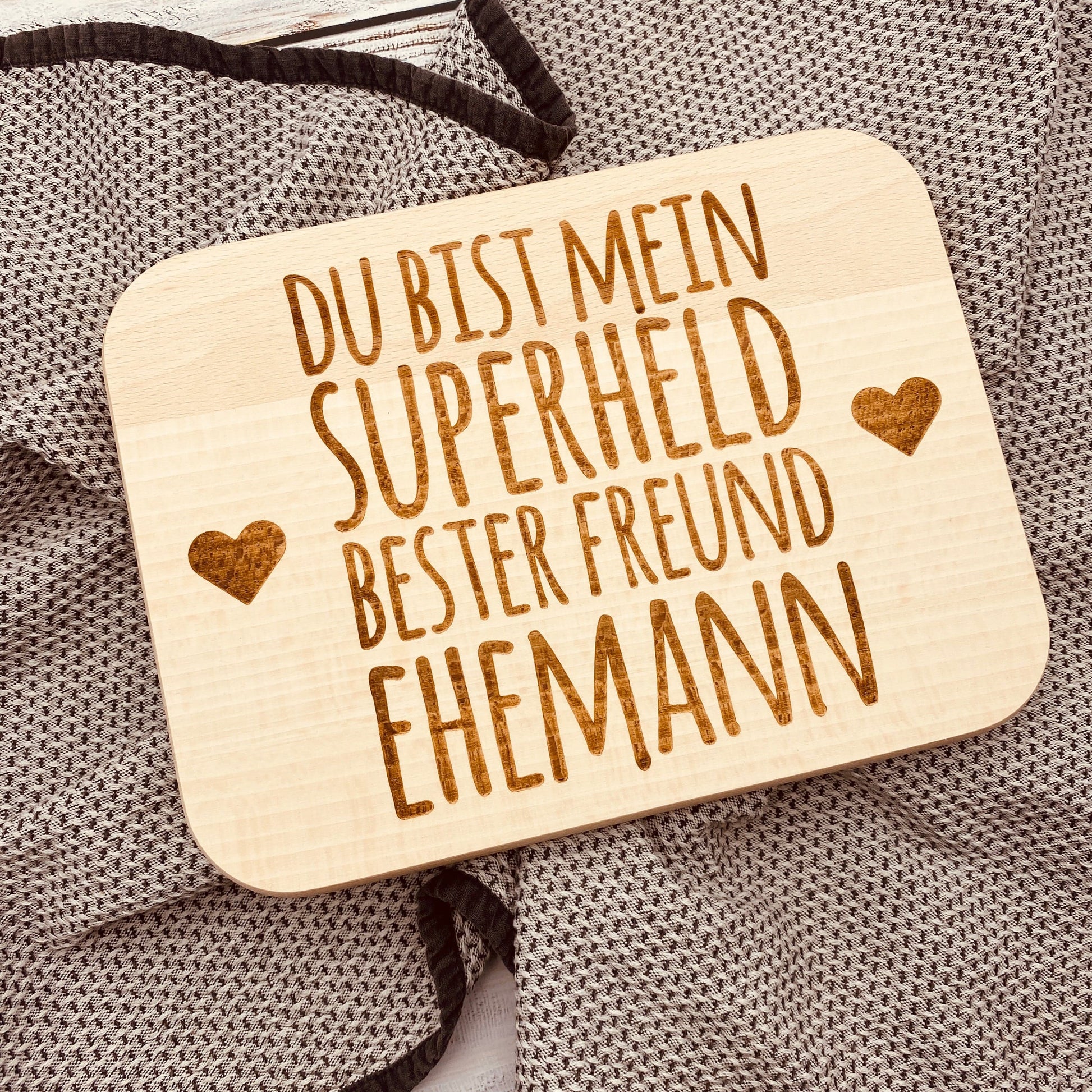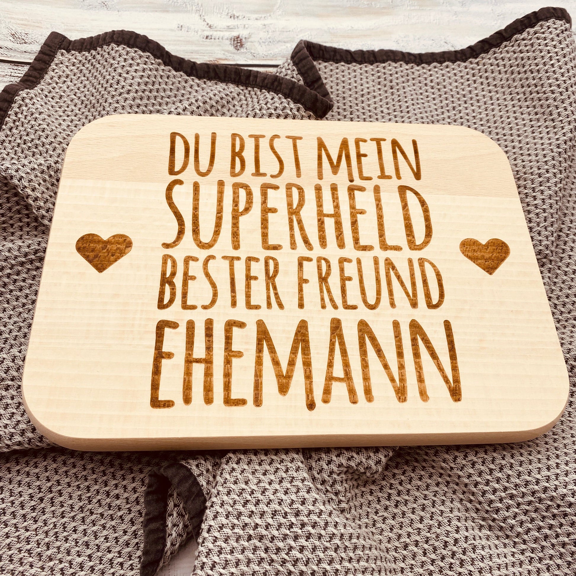 Dieses hochwertige Holzbrett mit Gravur ist die perfekte Geschenkidee für deinen Ehemann. Mit der liebevollen Botschaft „Du bist mein Superheld, bester Freund, Ehemann“ wird das Brett zu einem einzigartigen Symbol für Liebe und Partnerschaft.